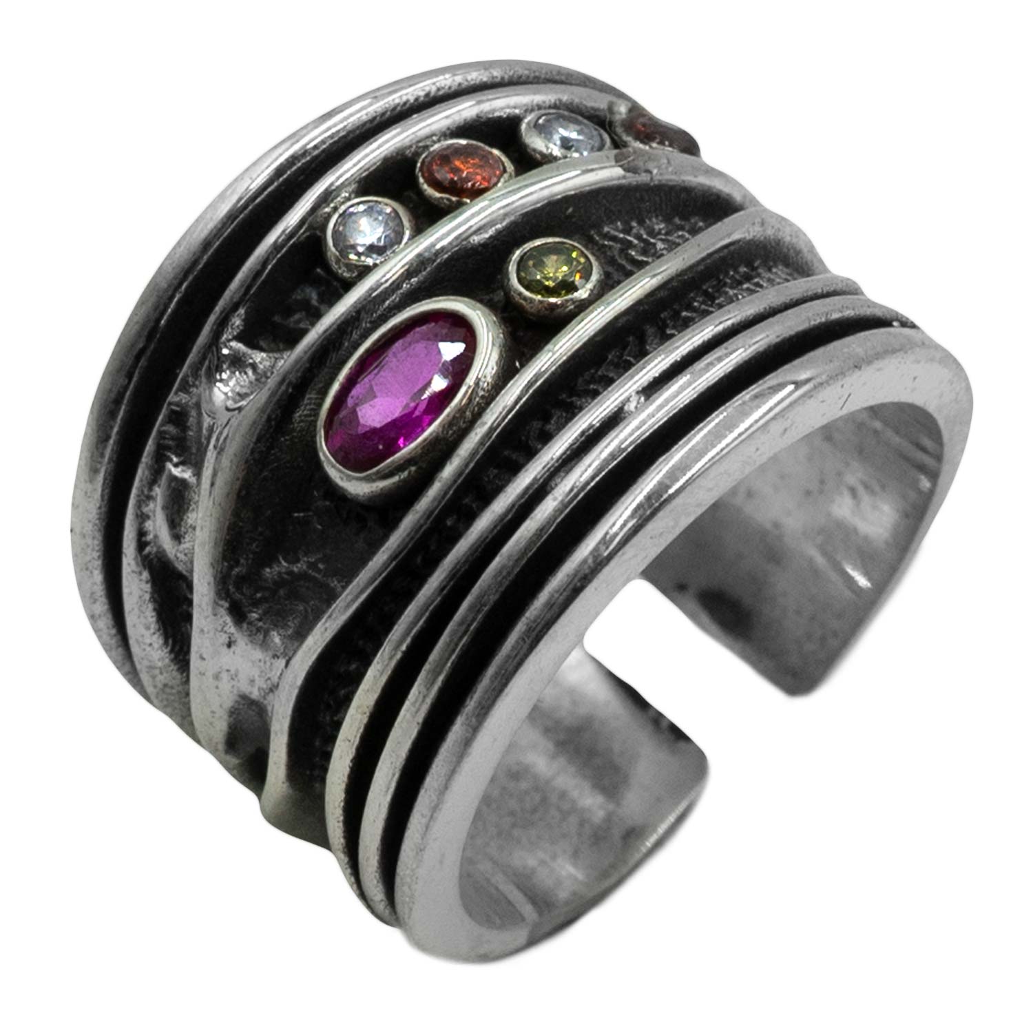 Ένα κομψό ασημένιο δαχτυλίδι 925, ανοιχτού τύπου, διακοσμημένο με φυσικές ημιπολύτιμες πέτρες που χαρίζουν μοναδική λάμψη και αυθεντικότητα. Κάθε πέτρα είναι προσεκτικά επιλεγμένη για το φυσικό της χρώμα και την ενέργεια που αποπνέει, δημιουργώντας ένα κόσμημα που συνδυάζει διακριτική πολυτέλεια και αισθητική ισορροπία.Το λεπτεπίλεπτο φινίρισμα του ασημιού αναδεικνύει τη φυσική ομορφιά των λίθων, καθιστώντας το ιδανικό για καθημερινή χρήση αλλά και για πιο ιδιαίτερες εμφανίσεις.