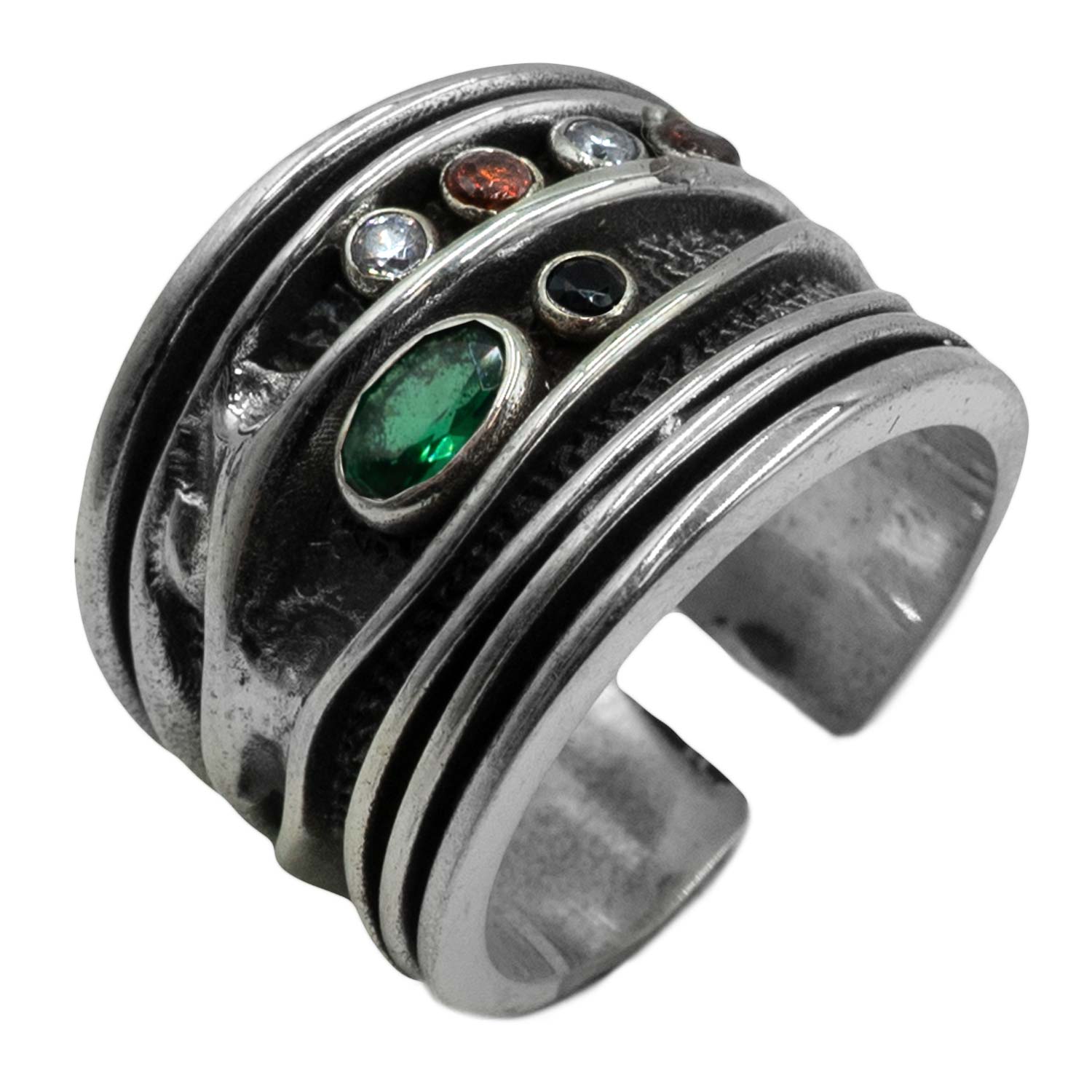 Ένα κομψό ασημένιο δαχτυλίδι 925, ανοιχτού τύπου, διακοσμημένο με φυσικές ημιπολύτιμες πέτρες που χαρίζουν μοναδική λάμψη και αυθεντικότητα. Κάθε πέτρα είναι προσεκτικά επιλεγμένη για το φυσικό της χρώμα και την ενέργεια που αποπνέει, δημιουργώντας ένα κόσμημα που συνδυάζει διακριτική πολυτέλεια και αισθητική ισορροπία.Το λεπτεπίλεπτο φινίρισμα του ασημιού αναδεικνύει τη φυσική ομορφιά των λίθων, καθιστώντας το ιδανικό για καθημερινή χρήση αλλά και για πιο ιδιαίτερες εμφανίσεις.
