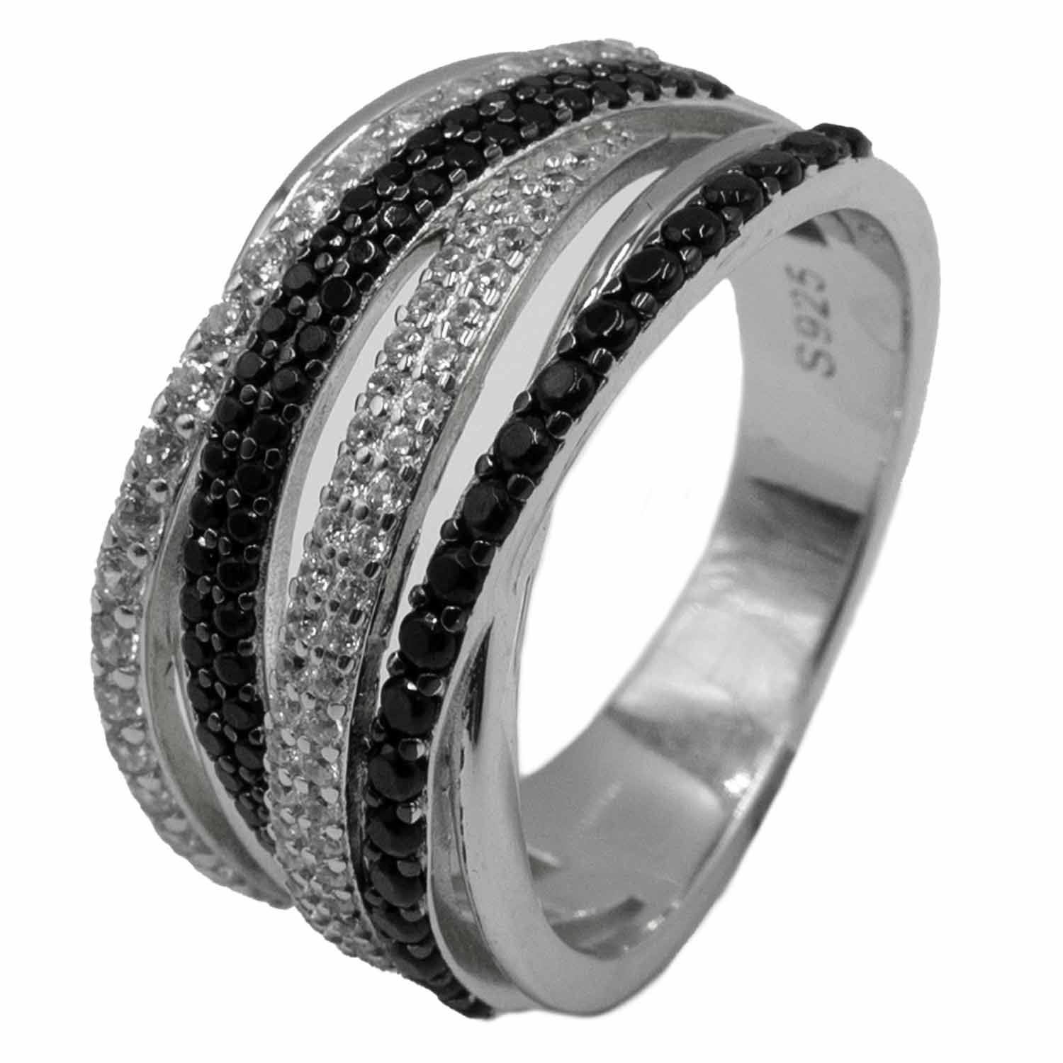 - Δαχτυλίδι ασημένιο επιπλατινωμένο με λευκά και μαύρα κρύσταλλα ζιργκόν υψηλής ποιότητας και διαύγειας