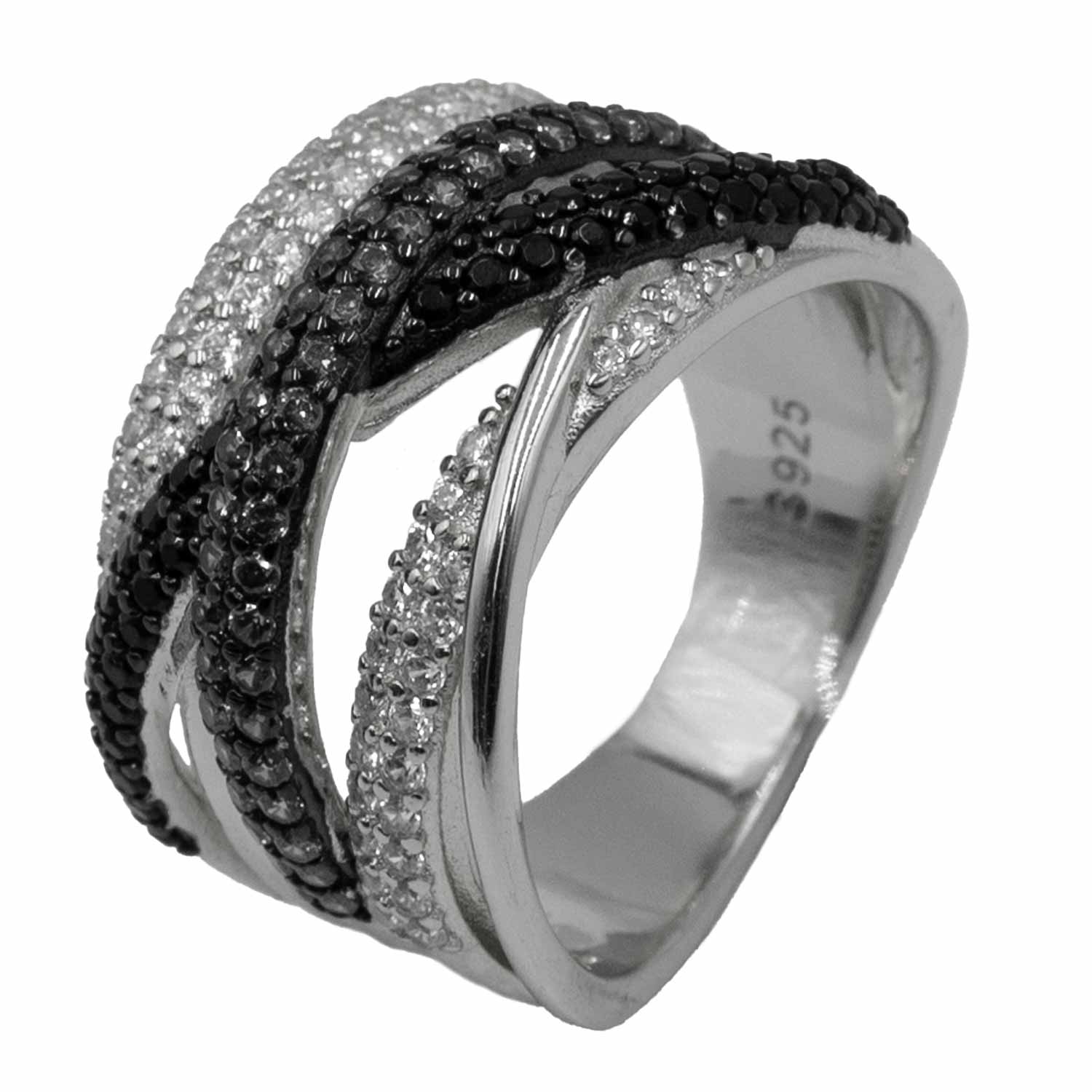 - Δαχτυλίδι ασημένιο επιπλατινωμένο με λευκά και μαύρα κρύσταλλα ζιργκόν υψηλής ποιότητας και διαύγειας