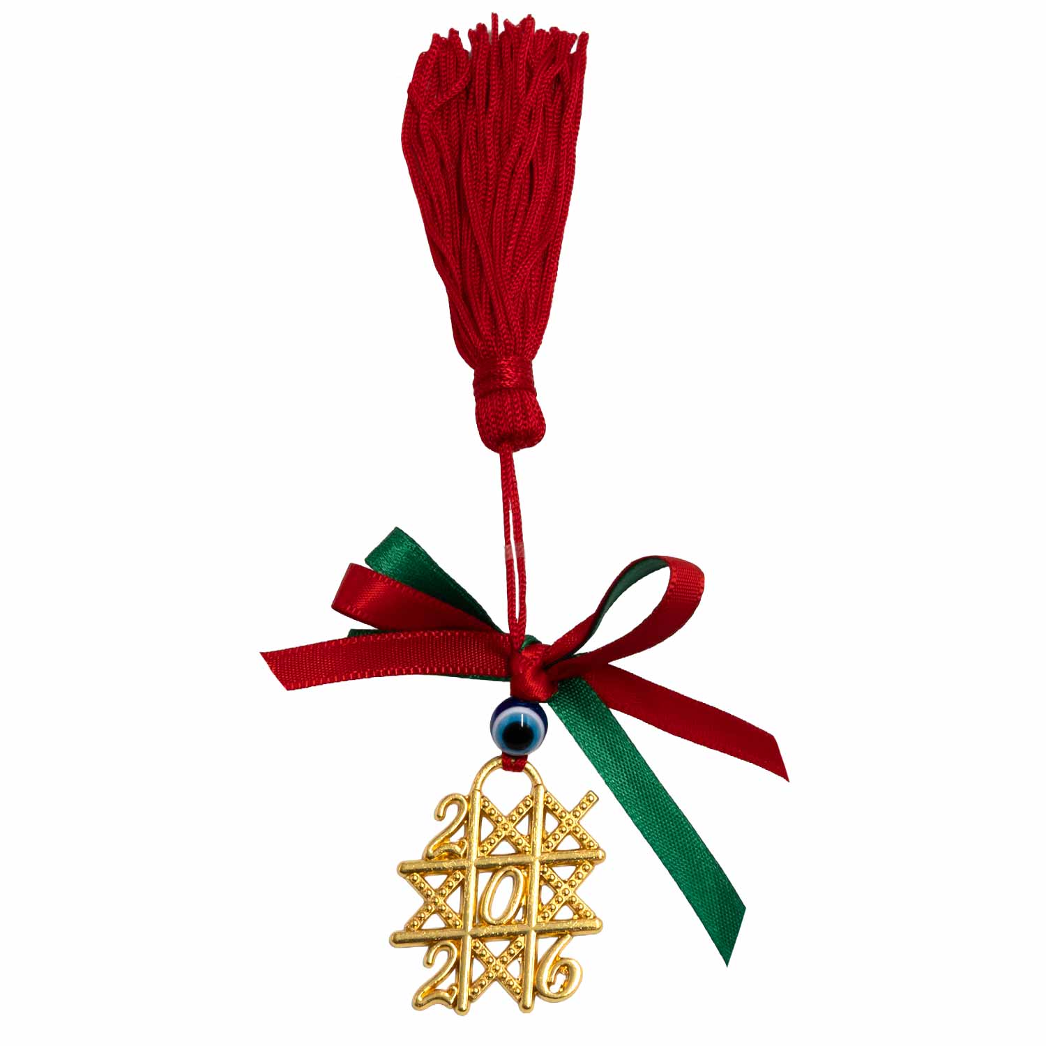 Το μεταλλικό στοιχείο «2026» προσδίδει λάμψη και αποτελεί το κεντρικό σύμβολο της νέας χρονιάς, ενώ το διακοσμητικό μοτίφ στολισμένο με λεπτομέρειες προσθέτει μια πνευματική, προστατευτική διάσταση.