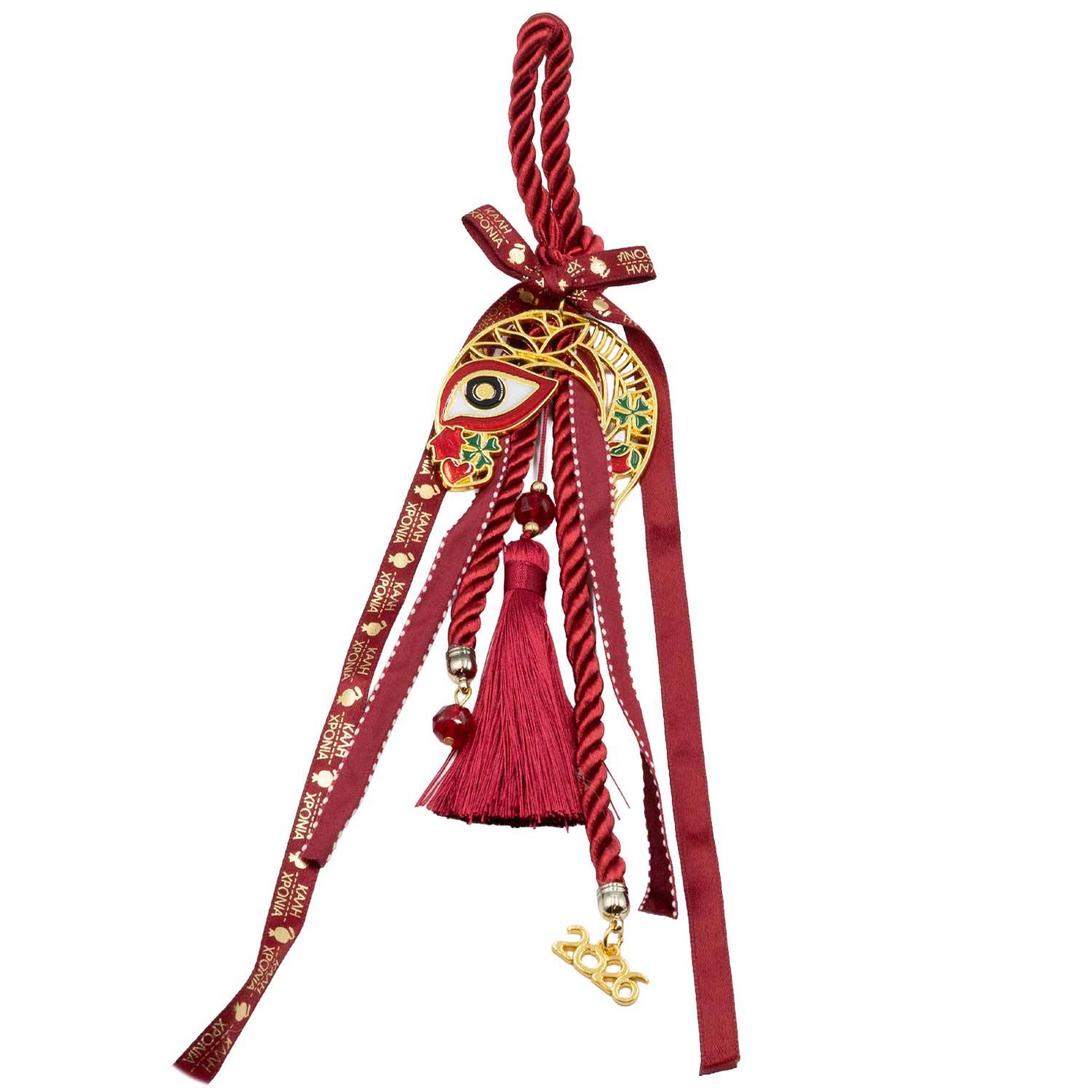 Το γούρι διαθέτει έναν εντυπωσιακό φιόγκο με ανάγλυφη υφή, διακοσμημένο με κορδόνια σε ζωντανές αποχρώσεις, λαμπερές χάντρες και μια υπέροχη φούντα που ολοκληρώνει το σύνολο με αριστοκρατικό ύφος.