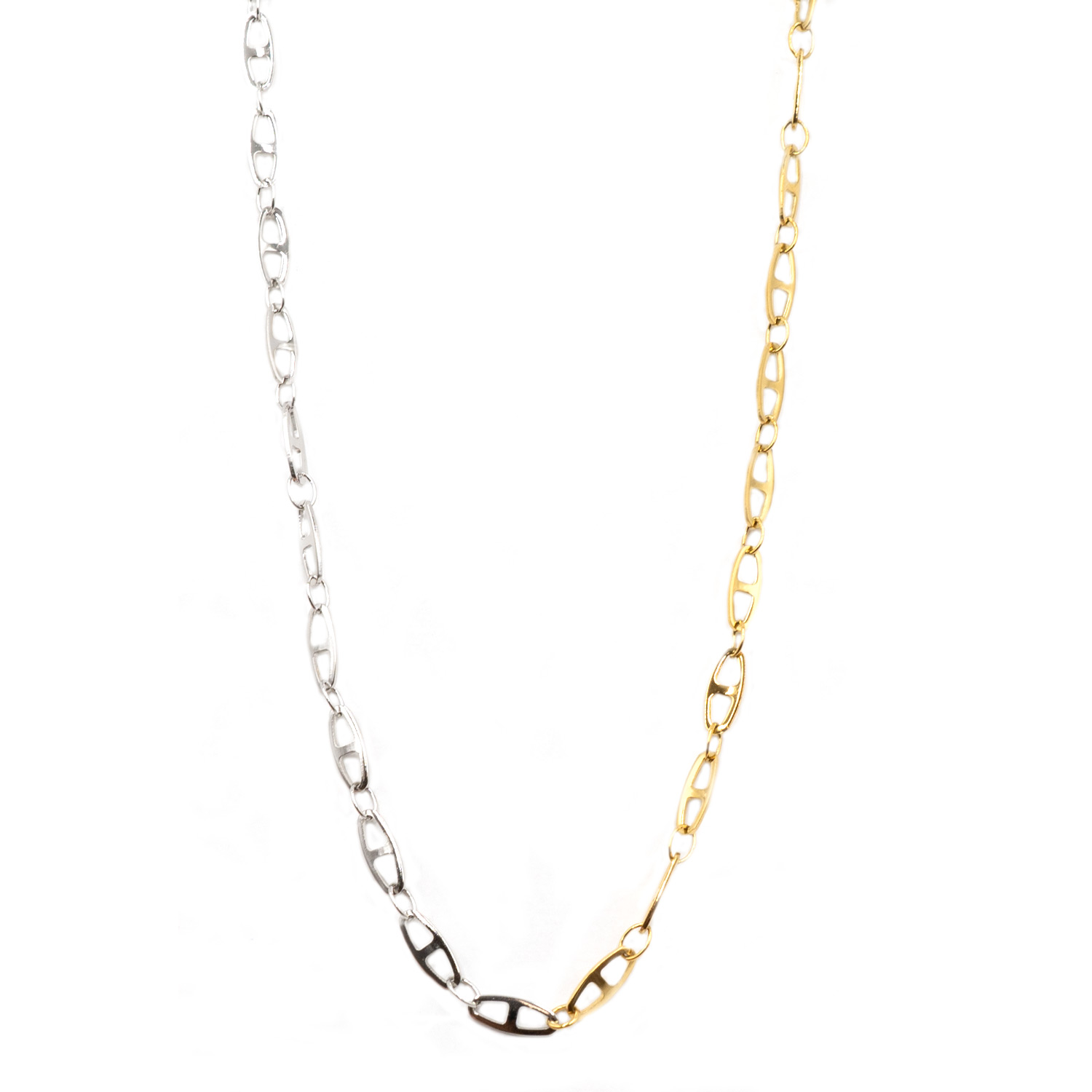 Αναδείξτε τη μοντέρνα κομψότητα σας με το εντυπωσιακό κολιέ από ανοξείδωτο ατσάλι, διακοσμημένο με εκλεπτυσμένο σχέδιο και διχρωμία. Ένα ιδιαίτερο κόσμημα που συνδυάζει τη διαχρονική αισθητική με τη σύγχρονη τάση των contrast αποχρώσεων, ιδανικό για κάθε γυναίκα που επιθυμεί ένα κομψό, ανθεκτικό και μοναδικό αξεσουάρ για κάθε περίσταση.